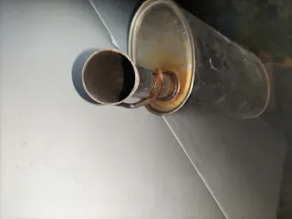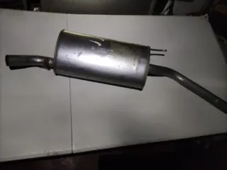 Silencioso trasero para Renault Clio del año 1990. - Material: Acero inoxidable. - Diseño: Rectangular con tubos de entrada y salida.