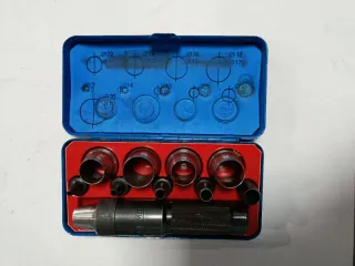 Set de sacabocados de la marca RIMO con diferentes punzones. - Incluye mango y varios punzones de distintos tamaños. - Los punzones tienen grabados los diámetros: 12, 13, 14, 15, 16, 17, 18, 20, 24.
