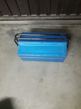 Caja de herramientas de color azul, con asas para facilitar su transporte. - Diseño metálico. - Asa plegable.