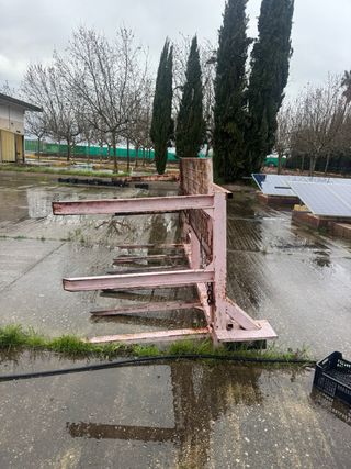 Rastrillo hilerador de gran tamaño, ideal para superficies extensas. - Estructura robusta de color rojo y amarillo. - Múltiples púas para un rastrillado eficiente. - Ruedas para facilitar el transporte y maniobrabilidad. Las púas de 7 mm se encargan del trabajo crucial. Están dispuestas con una distancia entre púas de 31,25 mm y en 6 filas. El objetivo principal es combatir las malas hierbas no deseadas. Altura de transporte 3,55 metros. Peso neto 1.200 kg. Solo con un par de usos, está nueva. Se puede ver sin compromiso.