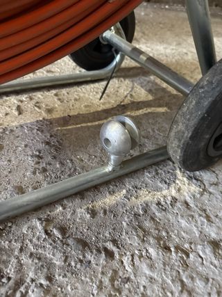 Herramienta para pasar cables de 150 metros de longitud y 12 mm de diámetro. - Carrete metálico con ruedas. - Varilla flexible de color naranja.