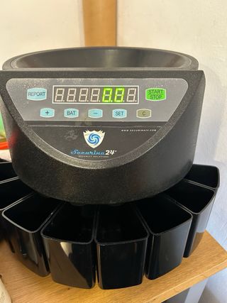 Máquina contadora de monedas Securina 24. - Pantalla digital. - Botones de control: REPORT, +, BAT, -, SET, C. - Botón START/STOP. - Base con compartimentos para monedas.