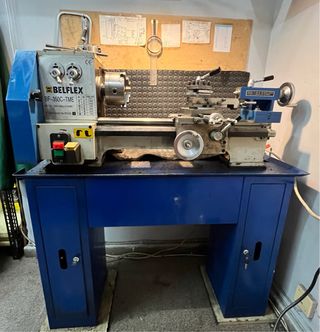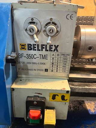 Torno paralelo de sobremesa Belflex BF-350 C-TME. - Modelo: BF-350C-TME - Motor: 220V/50Hz-0.55KW - Velocidades: 6 - Indicador CE Rango RPM desde 170r/m para roscado de materiales duros hasta 1950r/m para acabados finos. Incluye mesa bancada metálica original. RECOGER EN Barcelona 08015