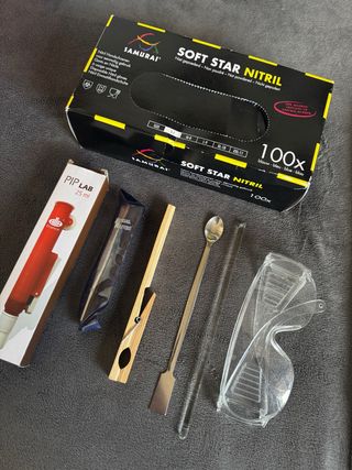 Kit de material básico para laboratorio. Lote de material de laboratorio en buen estado, ideal para estudiantes, prácticas, docencia o uso doméstico. - Caja de guantes de nitrilo SAMURAI SOFT STAR (100 unidades). - Pipeteador PIP LAB de 25 ml. - Pinzas de madera. - Espátula de laboratorio. - Varilla de vidrio. - Gafas de seguridad. Se vende todo junto. Posibilidad de entrega en mano o envío. Cualquier duda, ¡pregunta sin compromiso!