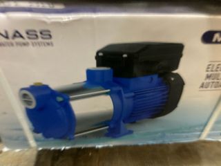 Bomba de agua eléctrica de la marca NASS, ideal para sistemas de bombeo. - Diseño compacto y moderno. - Carcasa de acero inoxidable y plástico. - Color azul y negro.