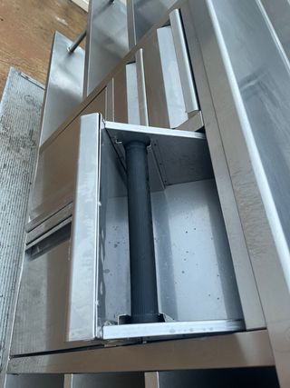 Mueble cafetero de acero inoxidable de la marca Infrico. Cuenta con varios compartimentos y cajones. - Fabricado en acero inoxidable. - Diseño funcional con compartimentos. - Marca: Infrico.