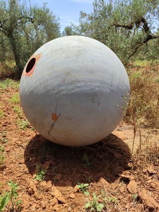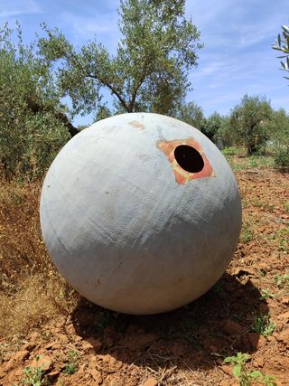 Gran depósito de poliéster en forma de esfera, con un diámetro de 5 metros. Se encuentra en buen estado, aunque presenta algunas marcas de uso. Escucho ofertas o cambio por algo que me interese - Diámetro: 5 metros - Material: Poliéster - Color: Gris Apertura 20 cm