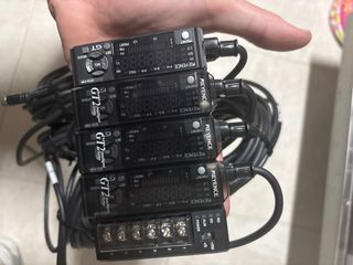 Medidor Keyence GT2-71P con cables. - Unidad principal con tres módulos. - Cables de conexión incluidos. - Conector de datos.