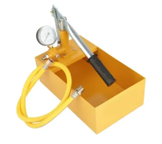 Bomba de prueba hidrostática de color amarillo. - Incluye manómetro. - Manguera de conexión amarilla. - Palanca de bombeo con empuñadura negra.