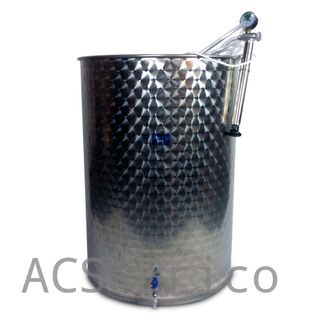 DEPOSITO INOX SIEMPRE LLENO 316 - 500 LITROS - 720x1250 MM Depósito, barril, bidón de 500 litros de acero inoxidable 316 con tapa de siempre lleno y fondo plano. Equipado con grifo. Ideal para la conservación de vino. Certificación para uso alimentario. Accesorios de serie: - Tapa superior flotante. - Cámara de aire. - Válvula de doble efecto. - Bomba con manómetro. - Pulido espejo interior. Características: - 720 mm de diámetro - 1250 mm de altura - Capacidad 500 litros - Calidad: Acero inoxidable AISI 316 - Fondo soldado - Cumple con la normativa de uso alimentaria.