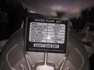Bomba de agua modelo SP15F. - Diámetro de conexión: 40mm/1.5 - Capacidad máxima: 18m³/h - Altura total de bombeo: 60m - Altura de succión: 8m - Potencia nominal: 6.7HP/4000rpm - Peso en seco: 24kg - Advertencia: NO FUNCIONAR EN SECO - Instrucciones: Verter agua de cebado completamente antes de usar.