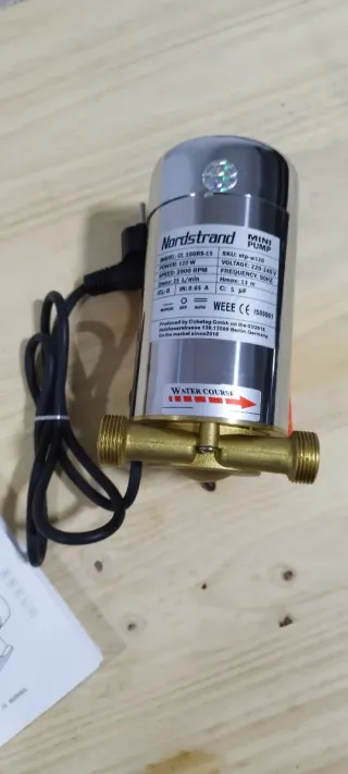 Bomba de agua Nordstrand, modelo CL 15GRS-15. - Potencia: 120 W - Voltaje: 220-240 V - Velocidad: 2900 RPM - Caudal máximo: 25 L/min - Intensidad: 0.65 A - Altura máxima: 13 m - Fabricada por Cubetag Gmbh en Berlín, Alemania. Nunca se uso, solo tiene rota una de las solapas de sujeción