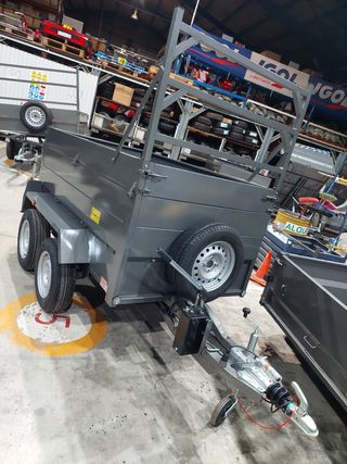 Remolque hidráulico basculante REFORZADO, electrosoldado. Carro para coche o turismo, NUEVO. Bomba hidráulica manual, provisto con freno de inercia a las 4 ruedas y estacionamiento. 2 ejes de 1000 kg cada uno, reforzados. Medidas de caja 2200 x 1280 x 500 + 300 de lateral abatibles desmontables. Puerta trasera tipo portón abatible, en rampa y desmontable. Lanza DOBLE reforzada, rueda hockey giratoria. Ruedas llanta 14 C de carga + repuesto. Cualquier otra medida se la fabricamos !! Alta calidad, garantía de fabrica, entrega inmediata o muy rápida de este modelo. 6--0.-2.-5.-.9-.6--1.-.2.-9 Envíos a toda la península en camión.