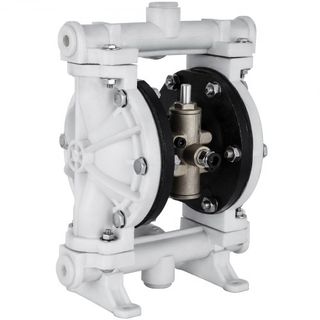 Bomba de Doble Diafragma Operada por Aire con Entrada y Salida, que cuenta con un robusto Cuerpo de Polipropileno y Diafragma Doble de PTFE. Esta bomba de transferencia neumática profesional es ideal para petróleo, diésel, aceite y fluidos de baja viscosidad. Tiene una tasa de flujo máxima de 2.5 GPM (9.46 L/min) y opera dentro de un rango de temperatura de -20℉ a 150℉. La bomba incluye una válvula de bola sellada, puertos de entrada y salida de 1/2 pulgada, y un tamaño de entrada de aire de FNPT 1/4 pulgada. Se auto-prima hasta 3 m (10 pies) en seco y 4.6 m (15 pies) en húmedo, con una presión máxima de 80 PSI y una altura máxima de 69 m (226.4 pies).