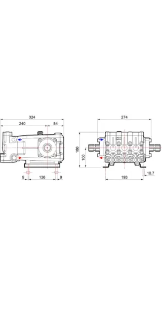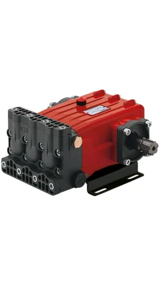Bomba de pistones de color rojo y negro. Bomba de 55l/m Bomba comet de pistones con salida de toma de fuerza por ambos lados para atomizador ,Presión máxima 50 bar - Diseño robusto. - Montaje en base metálica.