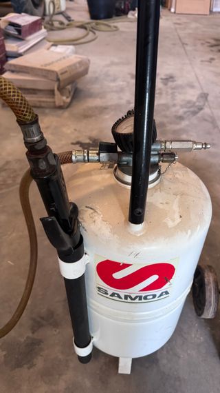 Se vende lote completoo por engrasador móvil SAMOA y bomba neumática PUMPMASTER 3, ambos en muy buen estado y con muy poco uso. Se trata de equipos accionados por aire comprimido, ideales para talleres mecánicos, mantenimiento industrial, agrícola o flotas de vehículos. El engrasador SAMOA incorpora depósito metálico con ruedas, regulador de presión, manómetro, manguera reforzada y pistola profesional. La bomba PUMPMASTER 3 está preparada para trasiego y suministro de aceites o lubricantes desde bidón, garantizando presión constante y alta fiabilidad. TXLF_ 6+6+6_4+1_2+3_9+0