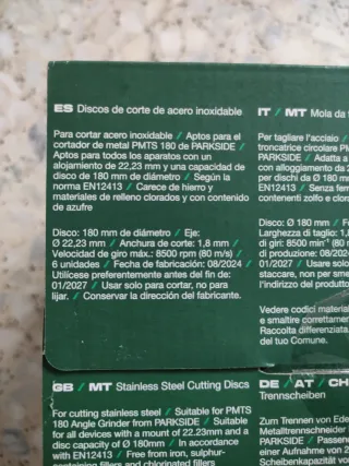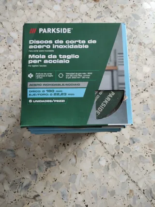 Pack de 6 discos de corte para acero inoxidable de la marca Parkside. - Diámetro del disco: 180 mm. - Diámetro del eje/foro: 22,23 mm. - Anchura de corte/grosor: 1,8 mm. - Velocidad máxima de giro: 8500 rpm (80 m/s Válidos para tronzadora Parkside , tengo 16 packs de 6 unidades el pack 4,25€ el pack