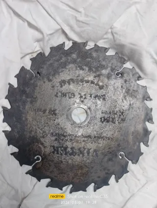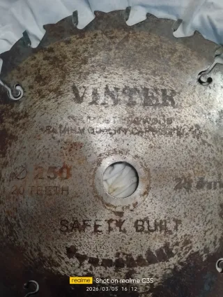Disco de sierra VINTER con 250 mm de diámetro y 20 dientes. Ai 2 unidades. 10€ por unidad - Diámetro: 250 mm - Número de dientes: 20 Tiene dos dientes rotos como se puede ver en las fotos - Marca: VINTER - Construcción: SAFETY BUILT