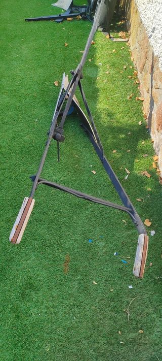 Arado antiguo de hierro, ideal para coleccionistas o amantes de la agricultura tradicional. Se encuentra en buen estado de conservación, considerando su antigüedad. - Fabricado en hierro. - Diseño clásico. - Ideal para decoración o uso agrícola.