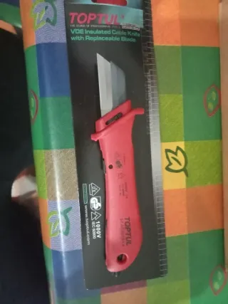Cuchillo para electricista con diseño VDE y hojas intercambiables. TOPTUL - Cuchillas recambiables. - Mango de plástico rojo y negro. - Aislamiento VDE 1000V.