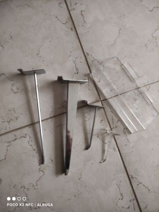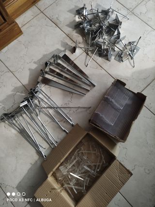 15 ganchos largos (30 cm) Total 9 euros. 4 ganchos largos reforzados (30 cm).Total 3 euros. 30 ganchos cortos (15 cm). Total 15 euros. 45 ganchos plástico (10 cm). Total 13,5 euros. 17 estantes pequeños plástico (25 cm). Total 14 euros. Todo el conjunto por 32 euros.