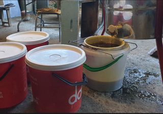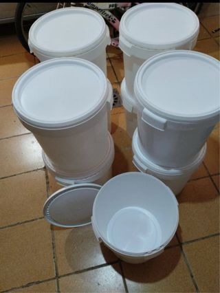 Conjunto de cubos blancos de plástico, ideales para almacenamiento o uso general. Uno de los cubos se encuentra abierto y con su tapa al lado. Uados para almacenaje de miel. Tambien hay miel disponible pero no se vende por aquí ya que no lo permiten - Material: Plástico - Color: Blanco - PRECIO UNITARIO