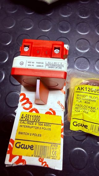 Interruptor de corte Gave, modelo A-5511000. -2 polos - 16A. - 600V. - Fabricado en España. Opcion maneta bloqueable con candado (15€)(Ref-AK1200523)