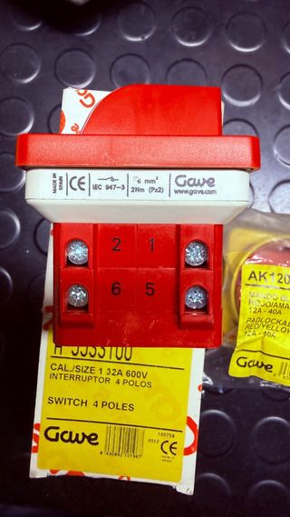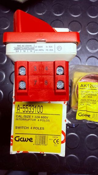 Interruptor Gave de 4 polos, modelo A-5533100. - Intensidad nominal (le): 32A - Tensión nominal (UI): 600V - Intensidad térmica (Ith): 40A - Frecuencia: 50-60Hz