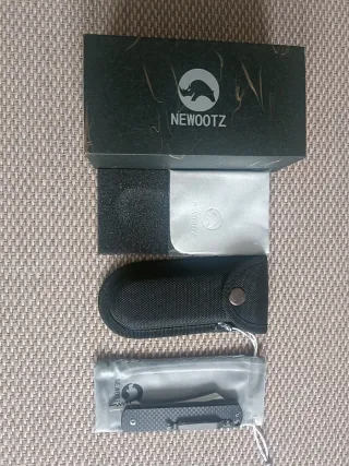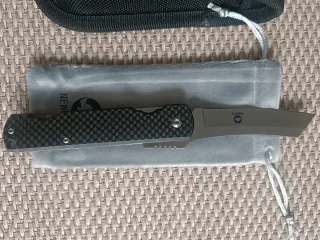 Navaja de estilo japonés Higonokami. Incluye funda protectora y bolsa de tela. - Hoja de acero. - Empuñadura con patrón de carbono. - Funda de nailon con cierre de botón. - Bolsa de transporte de tela suave.
