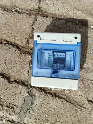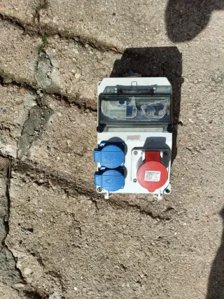 Cuadro eléctrico de obra industrial con varias tomas de corriente. - Dos tomas de corriente azules. - Una toma de corriente roja. - Tapa transparente con bisagras. Se escuchan ofertas razonables. Se vende todo junto o por separado