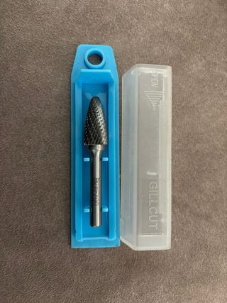 Fresa de metal duro de la marca Gillcut. - Forma cónica. - Incluye su estuche de plástico.