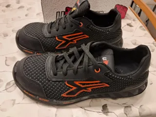 Zapatos de seguridad de la marca U-Power en color negro. Diseñados para ofrecer protección y comodidad. - Exterior de malla transpirable. - Detalle de logo U-Power en naranja. - Cierre con cordones.