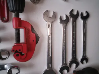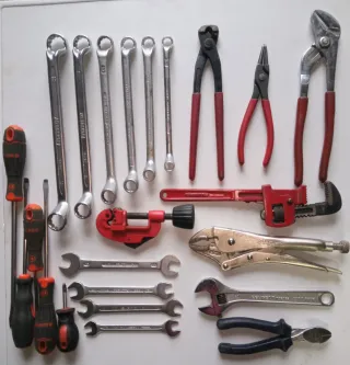 Conjunto de herramientas manuales para diversas tareas. - Llaves fijas y de estrella. - Alicates y tenazas. - Destornilladores. - Cortatubos. - Llave inglesa. - Mordaza de presión...