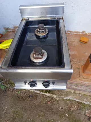 Cocina industrial de gas con dos quemadores. Fabricada en acero inoxidable, es robusta y fácil de limpiar. - Dos quemadores de gas. - Encimera de acero inoxidable. - Mandos frontales.