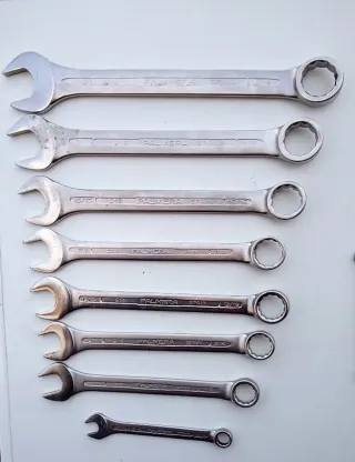 Conjunto de llaves de diferentes marcas y tamaños en pulgadas. - Incluye llaves Palmera mixtas nuevas y otras marcas varias. - Variedad de tamaños y tipos de llaves.
