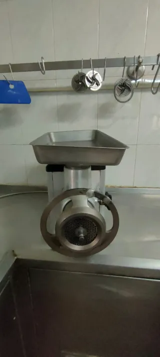 Picadora de carne de uso profesional. - Fabricada en acero inoxidable. - Bandeja superior para alimentos. - Diseño robusto y duradero.