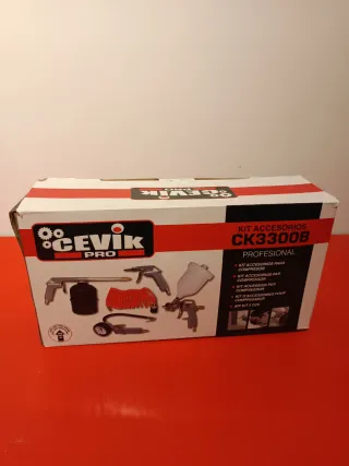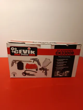 Kit de accesorios para compresor de la marca Cevik, modelo CK3300B. - Incluye pistola de soplado. - Manguera en espiral. - Pistola de pintura. - Manómetro. - Bomba de inflado.
