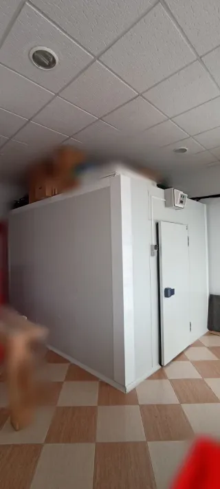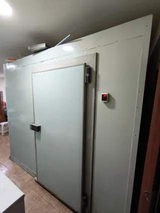 Cámara frigorífica usada, ideal para fruterías o restaurantes. Se encuentra en buen estado, aunque presenta algunos signos de uso. - Cámara frigorífica de tamaño considerable. - Puerta blanca con cierre de seguridad. - Estructura de paneles.