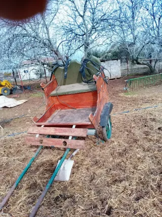 Carrito de madera para poni, ideal para paseos. Para restaurar. Los arneses de cuero son nuevos. Solo los arneses me costaron 350€ nuevos Teléfono 630843298