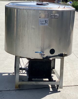 Tanque de frío de acero inoxidable con soporte y sistema de refrigeración. - se hizo soporte para elevar el tanque, y el equipo de frio se adapto debajo para que no ocupe mas que el hueco del tanque en si !! Se puede mover con transpalet o carretilla elevadora