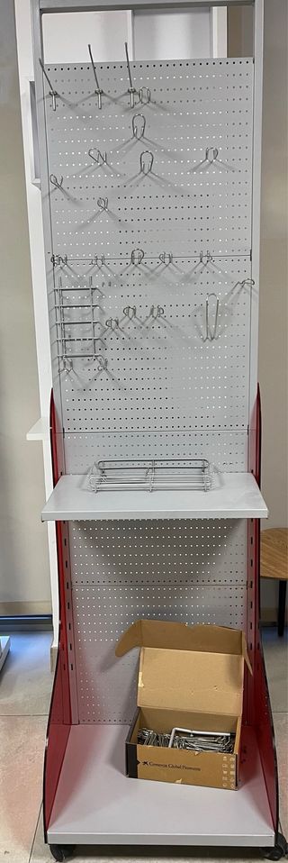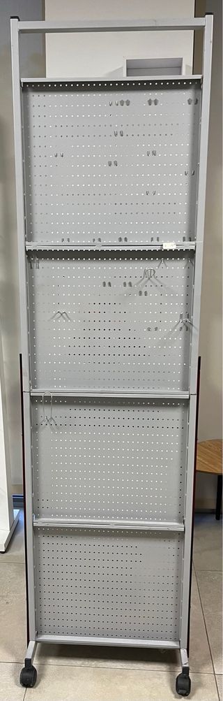Expositor metálico de cuatro niveles con ruedas para facilitar su movilidad. Ideal para exhibir productos. - Estructura de metal resistente. - Paneles perforados. - Cuatro ruedas giratorias en la base.