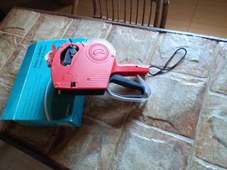 Etiquetadora de precios manual en buen estado. Es roja y parece estar en perfectas condiciones. - Permite etiquetar precios con hasta 8 dígitos. - Incluye una línea de impresión. - Ideal para tiendas y negocios.