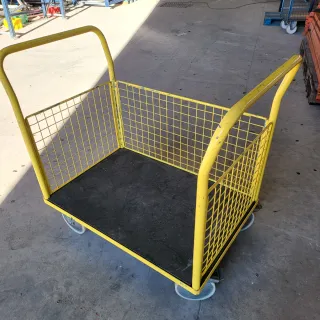 Carrito de transporte de color amarillo con estructura de rejilla metálica y base negra. - Ruedas para facilitar el desplazamiento. - Asa para un mejor agarre. - Diseño abierto con rejilla en los laterales y la parte trasera.
