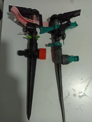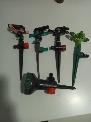 Conjunto de cinco aspersores de riego para jardín. 3 en buen estado 2 aceptables - 2 funcionan bien( foto 2) - 2 giran pero no tienen tope (foto 3) - El redondo funciona bien - se regalan otros dos que no giran.