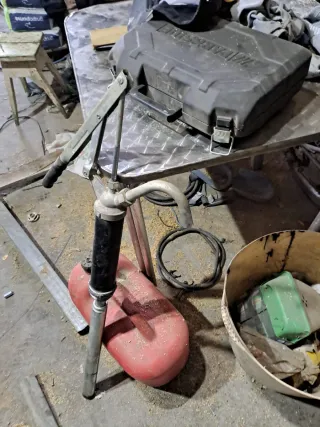 Bomba manual para bidón de combustible. Ideal para transferir líquidos de forma segura. - Cuerpo de metal resistente. - Mango ergonómico para un agarre cómodo. - Tubo de succión. - Manguera flexible.