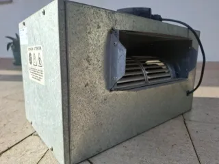 Caja de ventilación monofásica de 37W. Aspecto exterior mejorable aunque nunca se instaló. - Material: Metal galvanizado. - Tipo de ventilador: Centrífugo.