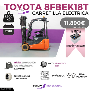 MÁQUINA FABRICADA EN 2018. LUNA DELANTERA. 4ª VÁLVULA. RUEDAS BLANCAS ANTIHUELLA. Carretilla elevadora eléctrica TOYOTA. Capacidad: 1.800 kg. Mástil tríplex con elevación libre y desplazador, 5.000 mm. Luces delanteras LED de alta luminosidad. Respuesta rápida, eficiencia y muy buena maniobrabilidad. Ref: 2777. Modelo:8FBEK18T. Europa Elevación. ¡Tenemos tu máquina! Llámanos sin compromiso. Disponemos de atención comercial 24 horas. Enviamos a toda España.