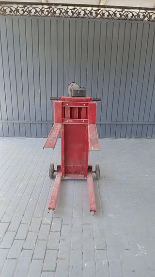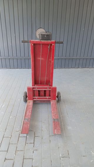 Carretilla elevadora manual en buen estado. Ideal para levantar y transportar cargas. - Dispone de dos ruedas para facilitar el desplazamiento. - Estructura robusta de color rojo. - Sistema de elevación manual.