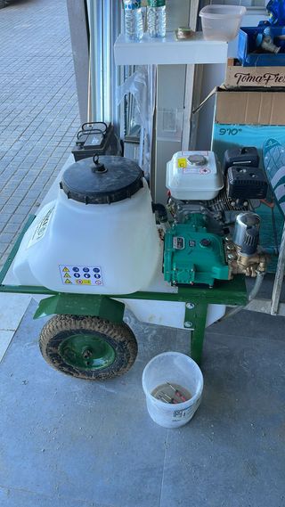 Carretilla pulverizadora para fumigar, con motor y depósito. Se ha usado en 3 ocasiones. Está nueva. - Marca: CAFRAN - Incluye manguera enrollada. - Ruedas para fácil transporte. - Depósito de gran capacidad 100l.