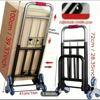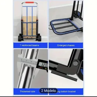 Carretilla plegable ligera y fácil de transportar. Ideal para mudanzas o tareas de carga. - Capacidad de carga: 70kg (27€) - Estructura de aluminio resistente - Diseño plegable para un fácil almacenamiento - Ruedas resistentes para una movilidad suave